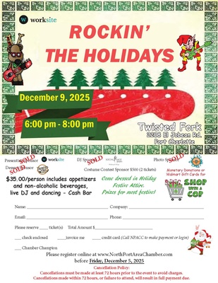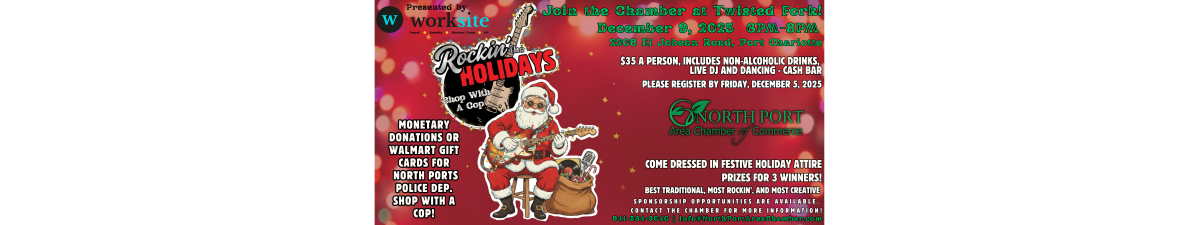 Join the North Port Area Chamber for Rockin' The Holidays on Tuesday, December 9, 2025 from 6:00 - 8:00 pm at Twisted Fork located at 2208 El Jobean Road in Port Charlotte. Come dressed in Holiday Festive Attire. Prizes for most festive!