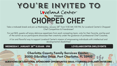 Take a midweek break and join us Wednesday, January 28th from 11:30 AM–1:00 PM, for Loveland Center’s Chopped Chef Competition & Friendraiser!