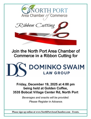 Join the North Port Area Chamber of Commerce for a Ribbon Cutting for Dominko & Swaim Law Group on Friday, December 19, 2025 at 4:00 pm at Golden Coffee - 3535 Bobcat Village Center Road, North Port. Beverages and snacks will be provided.