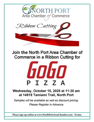 Join the North Port Area Chamber of Commerce for the Ribbon Cutting of GoGo Pizza on Wednesday October 15 2025, at 11:30 am at 14919 Tamiami Trail, NP.