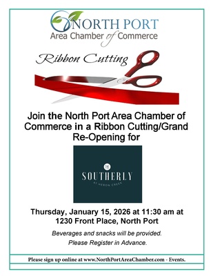 Join the North Port Area Chamber of Commerce for a Ribbon Cutting/Grand Re-Opening for The Southerly at Heron Creek on Thursday, January 15, 2026 at 1230 Front Place, North Port. Raffles and specials, catered snacks and drinks will be provided.